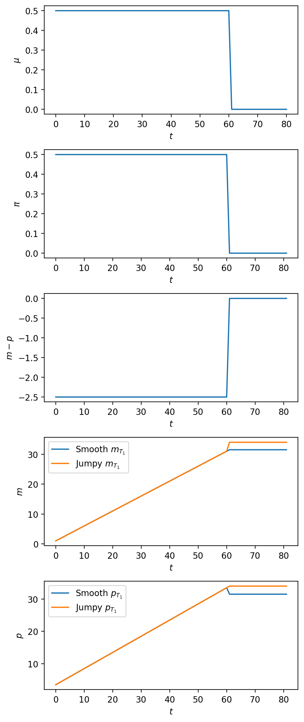 The bottom two panels plot \(m\) and \(p\) under two possible ways that \(m_{T_1}\) might adjust as required by the upward jump in \(m - p\) at \(T_1\).