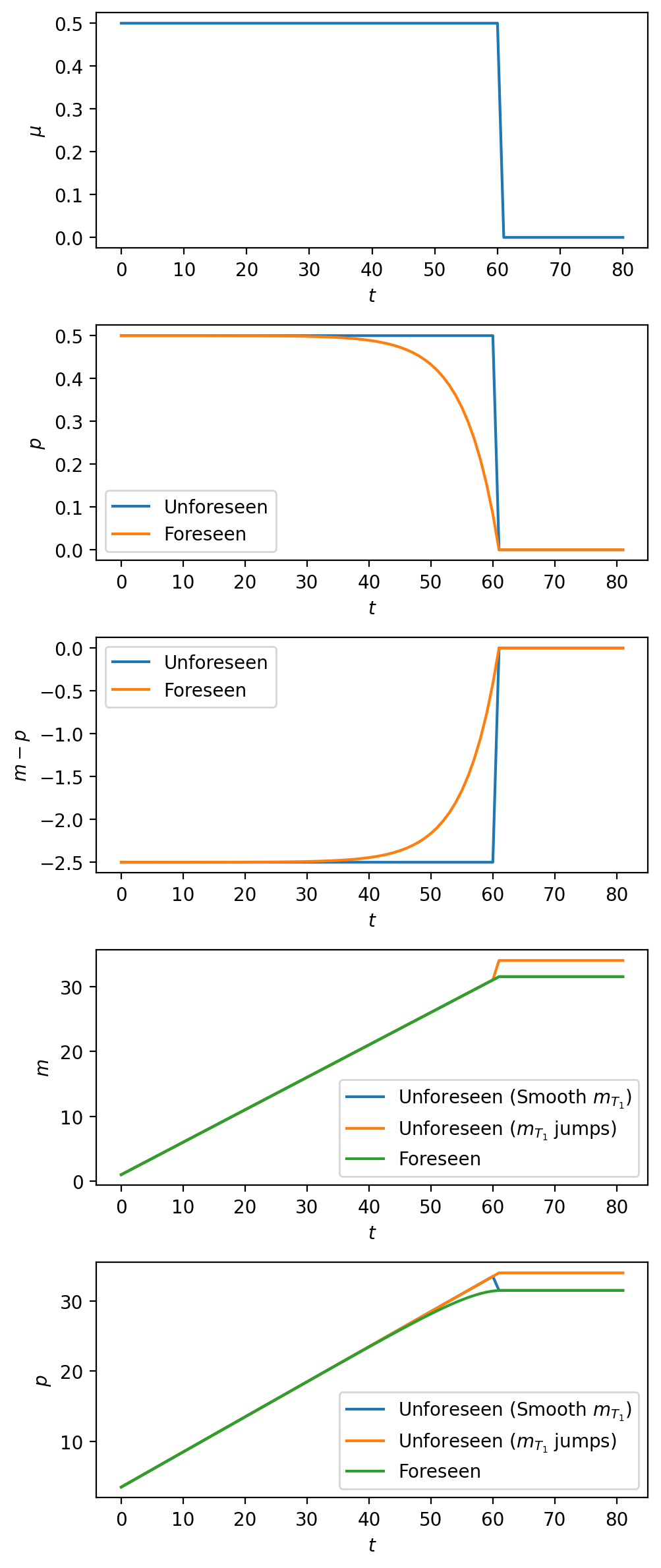 While the log money supply portrayed in the bottom panel has a kink at \(T_1\), the log price level does not – it is “smooth” – once again a consequence of the fact that the reduction in \(\mu\) has been foreseen.