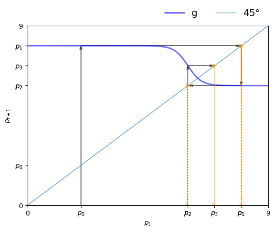 If \( g \) hits the 45-degree line at \(p_t\), then we have \( p_{t+1} = p_t \), so \( p_t \) is a steady state.