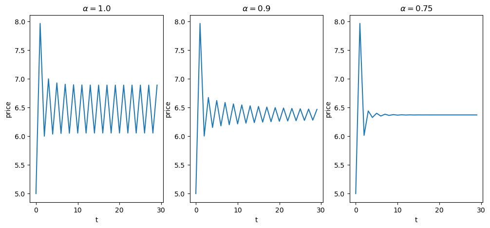 Let’s try to simulate the price and observe the dynamics using different values of \(\alpha\).
