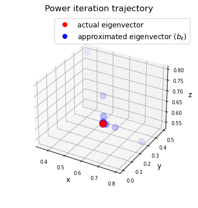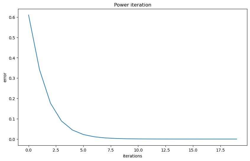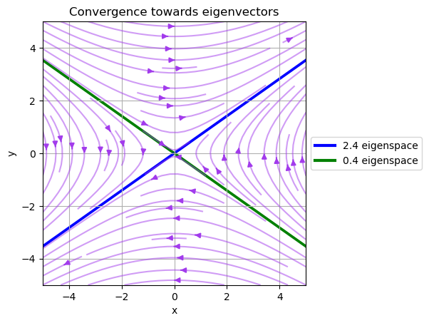 Note that the vector field converges to the eigenvector of \(A\) with the largest eigenvalue and diverges from the eigenvector of \(A\) with the smallest eigenvalue.
