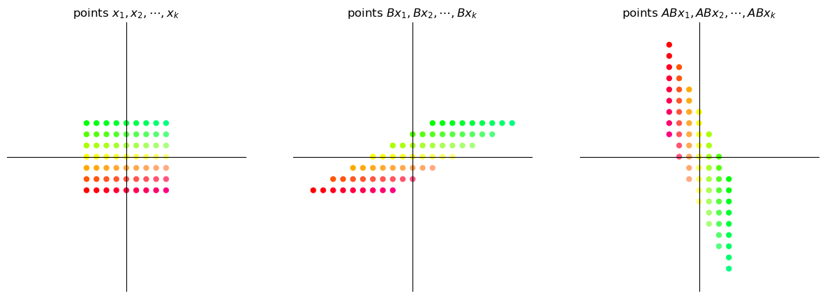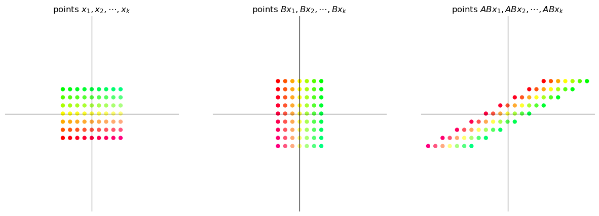 Thus, if \(A\) and \(B\) are transformations such that \(A \colon \mathbb{R}^m \to \mathbb{R}^n\) and \(B \colon \mathbb{R}^k \to \mathbb{R}^m\), then \(AB\) transforms \(\mathbb{R}^k\) to \(\mathbb{R}^n\).