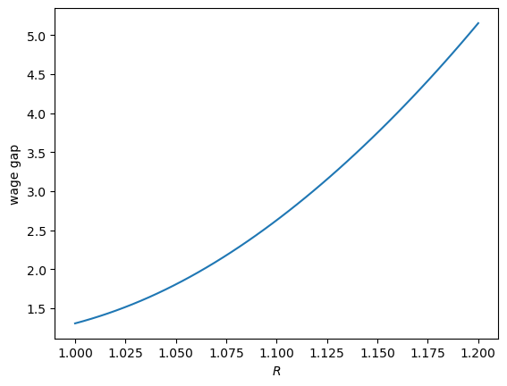 Thus, as with our earlier graph, we find that raising \(R\) increases the initial college wage premium \(\phi\).