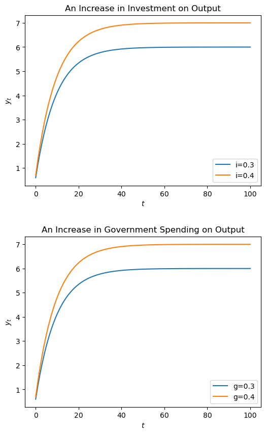 Notice here, whether government spending increases from 0.3 to 0.4 or investment increases from 0.3 to 0.4, the shifts in the graphs are identical.