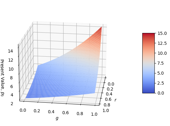 We can use a little calculus to study how the present value \(p_0\) of a lease varies with \(r\) and \(g\).