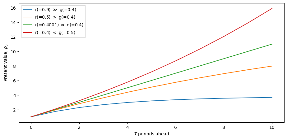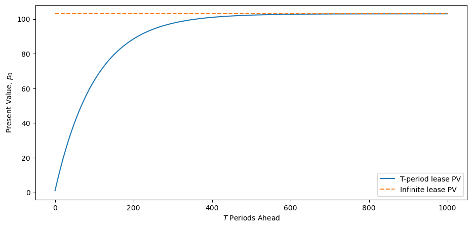 This graph gives a big hint for why the condition \(r > g\) is necessary if a lease of length \(T = +\infty\) is to have finite value.