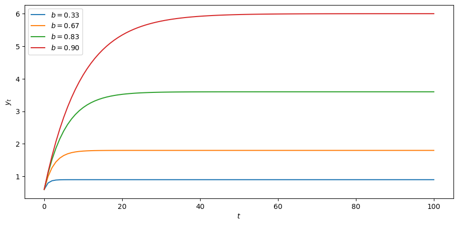 We will now go back to the case of the Keynesian multiplier and plot the time path of \(y_t\), given that consumption is a constant fraction of national income, and investment is fixed.