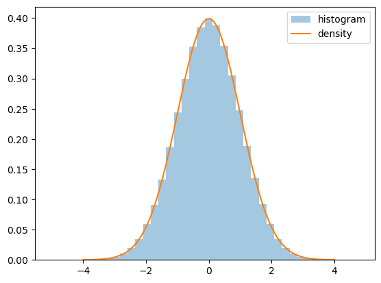 We can see this when we plot the density and show a histogram of observations, as with the following code (which assumes \(\mu=0\) and \(\sigma=1\)).