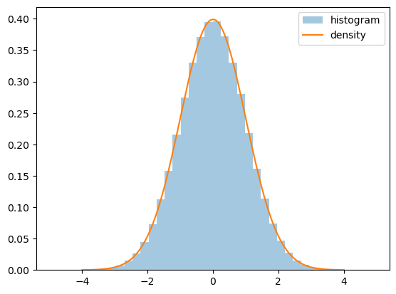 We can see this when we plot the density and show a histogram of observations, as with the following code (which assumes \(\mu=0\) and \(\sigma=1\)).