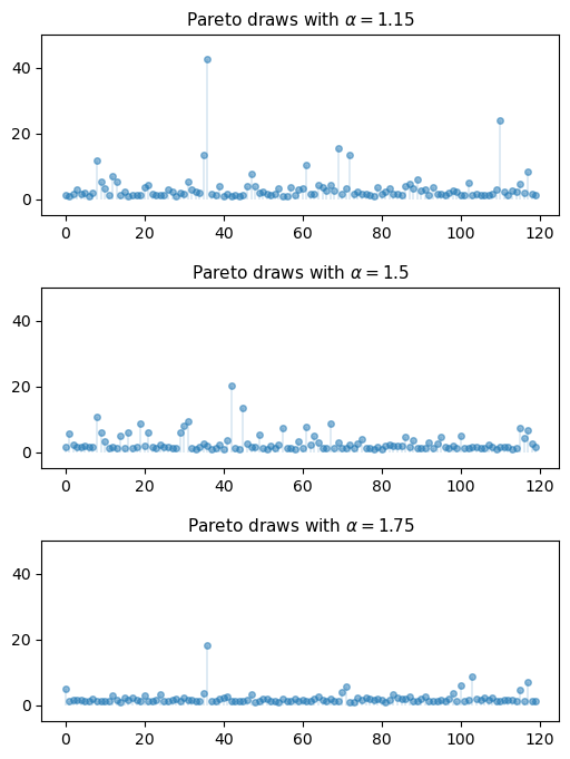 ax.set_title(f"Pareto draws with $\\alpha = {a}$", fontsize=11)