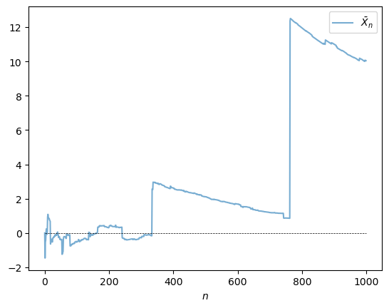 We have plotted each individual draw \(X_i\) against \(i\).