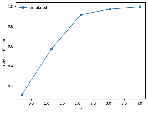 For each \(\sigma\), generate 2,000 independent draws of \(w_\sigma\) and calculate the Lorenz curve and Gini coefficient.