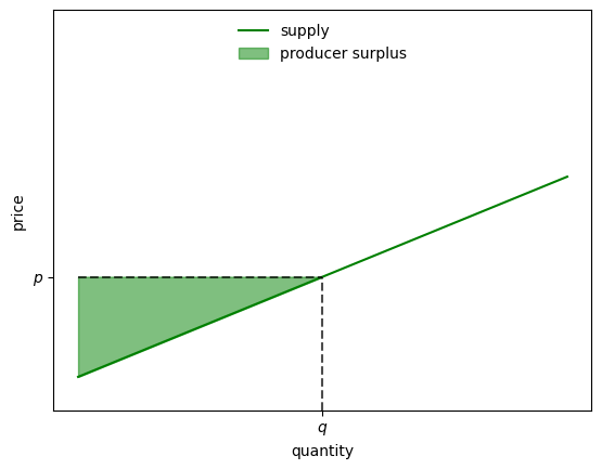 We define producer surplus as \(p q\) minus the area under an inverse supply curve