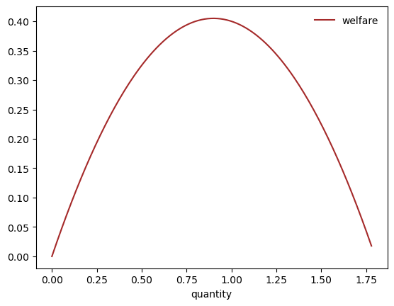 To compute a quantity that maximizes the welfare criterion, we differentiate \(W\) with respect to \(q\) and then set the derivative to zero.