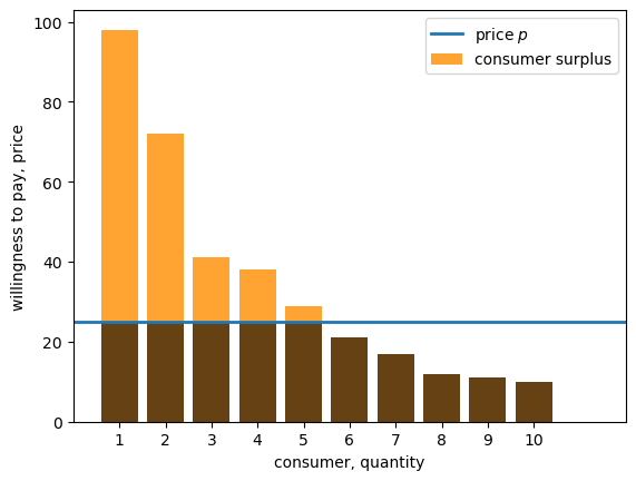 ax.bar(consumers, wtp, label="consumer surplus", color="darkorange", alpha=0.8)