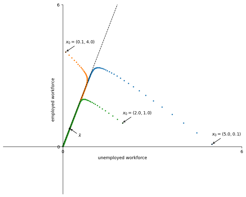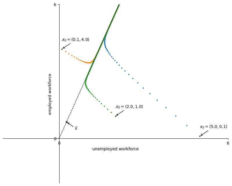 In detail, we have the unemployment rates and employment rates: \(x_t / n_t = A^t n_0 / n_t \to \bar{x}\) as \(t \to \infty\).