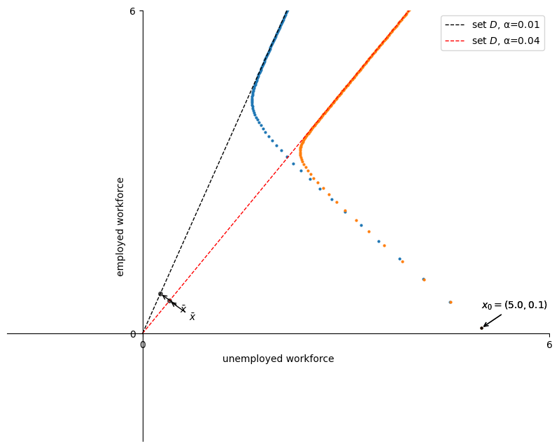ax.plot([0, s * lm.ū], [0, s * lm.ē], "k--", lw=1, label='set $D$, α=0.01')