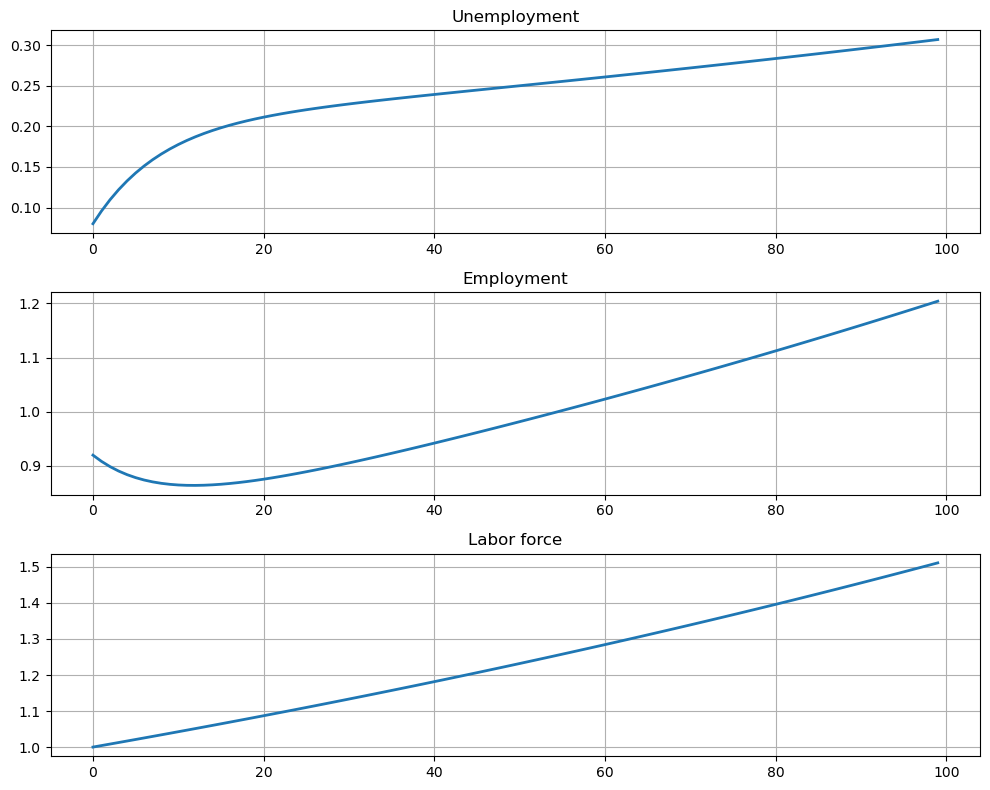 In the example illustrated above we considered parameters such that overall growth rate of the labor force \(g>0\).