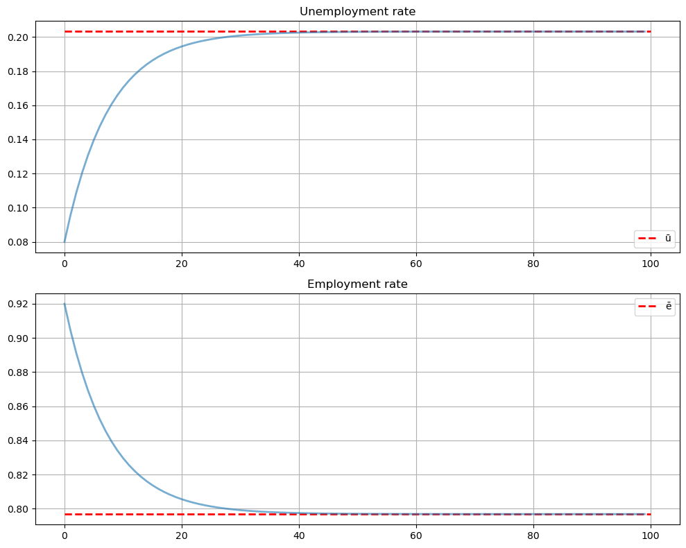 The latter implies that \(\bar{u}\) and \(\bar{e}\) are long-run unemployment rate and employment rate, respectively.