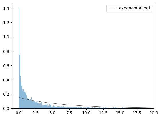 ax.plot(x, dist_exp.pdf(x), 'k-', lw=0.5, label='exponential pdf')