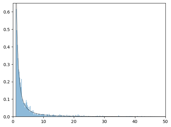 ax.plot(x, dist_pareto.pdf(x), 'k-', lw=0.5, label='Pareto pdf')