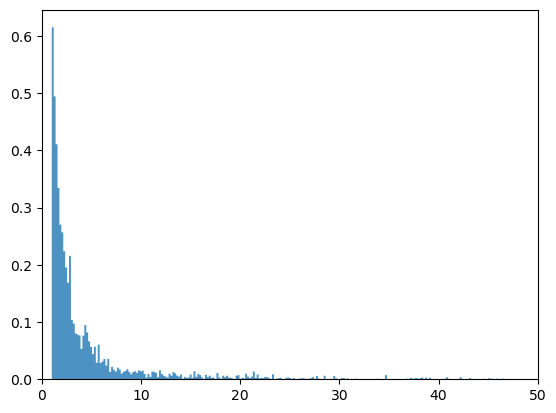 ax.hist(sample_tail, density=True, bins=500, histtype='stepfilled', alpha=0.8)