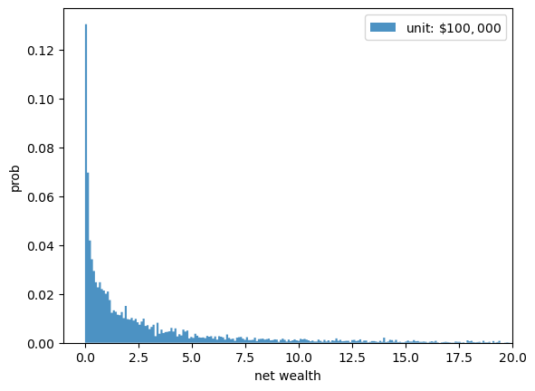 The histogram shows that many people have very low wealth and a few people have very high wealth.