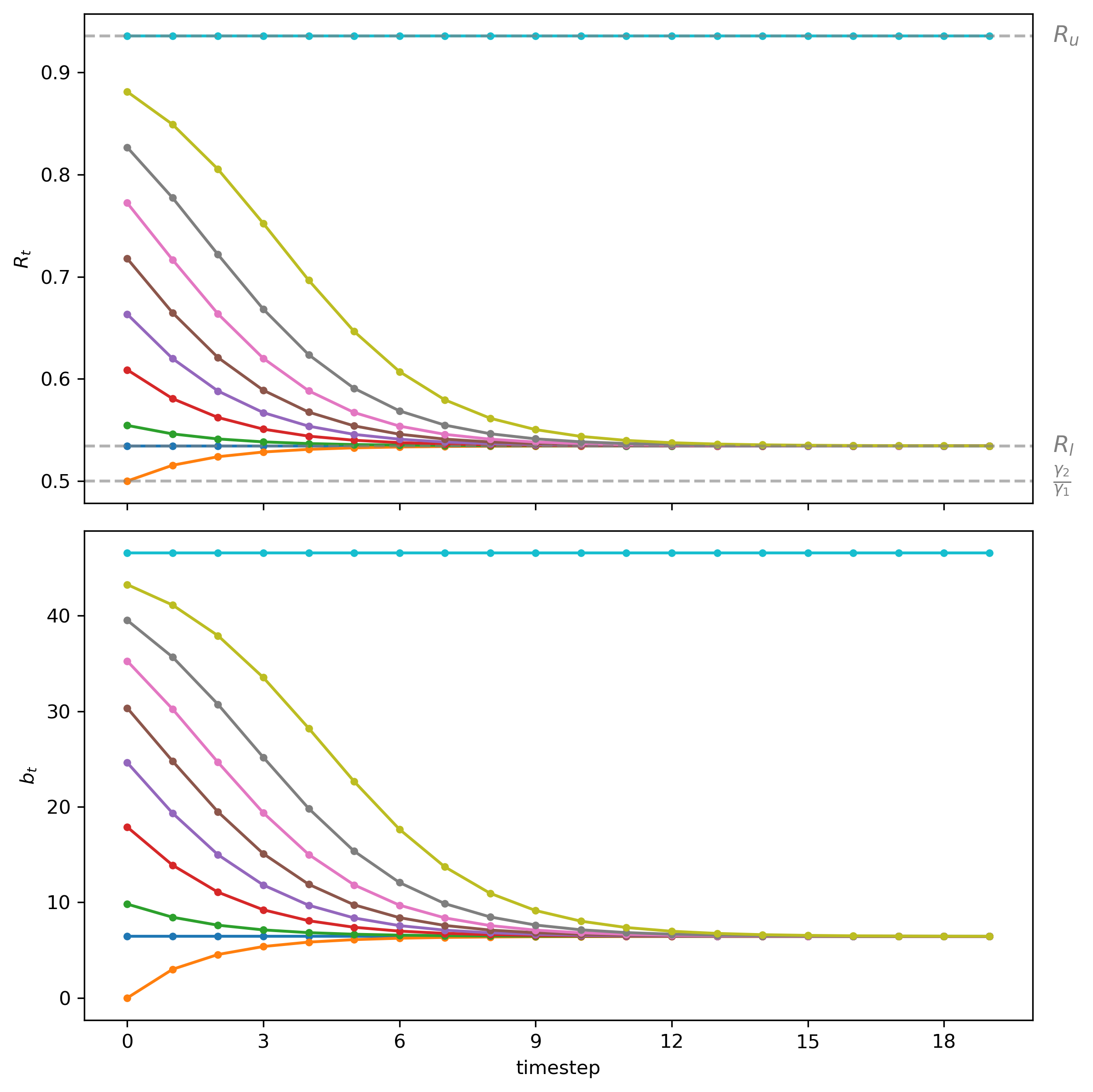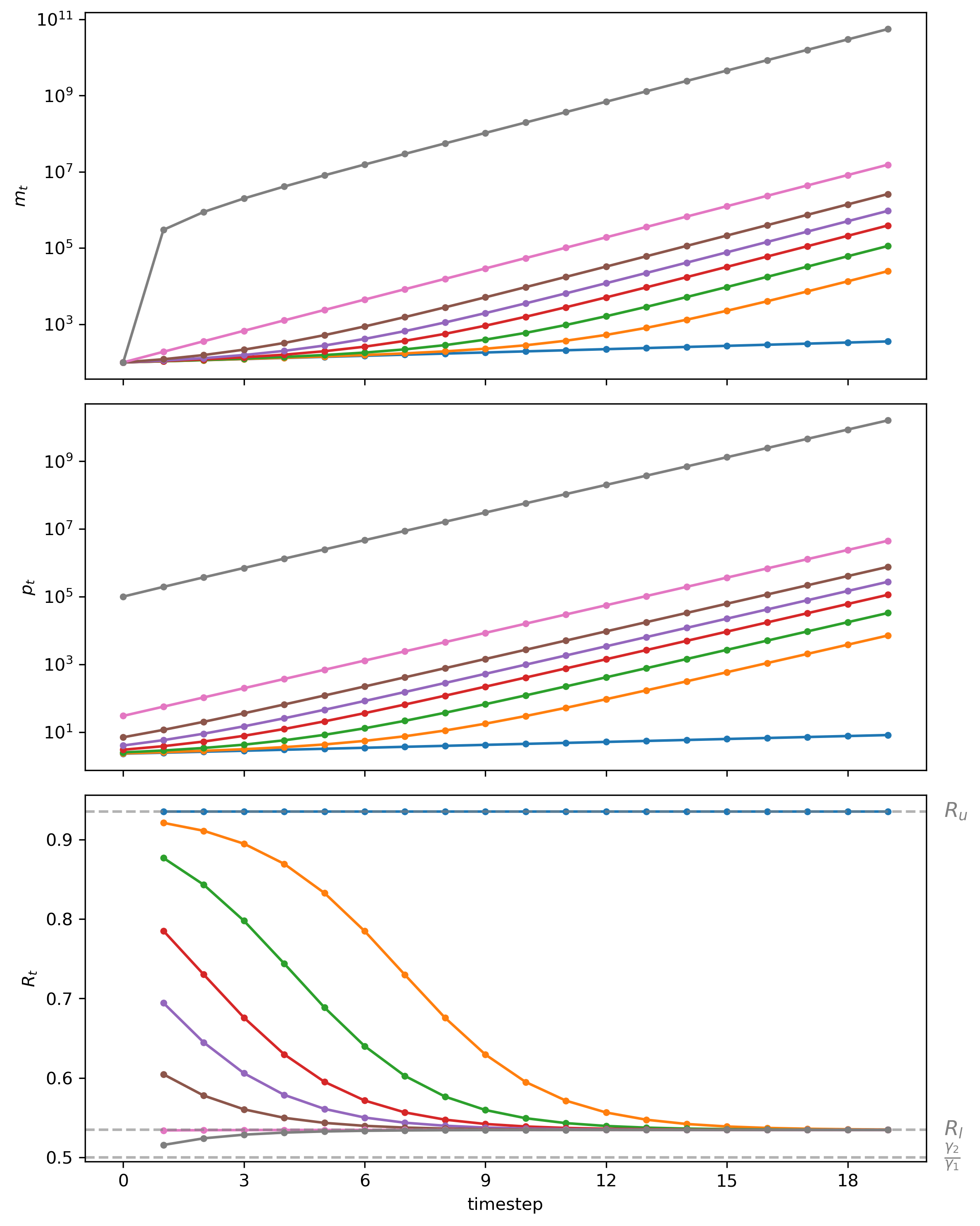 Now let’s visualize the dynamics of \(m_t\), \(p_t\), and \(R_t\) starting from different \(p_0\) values to verify our claims above.
