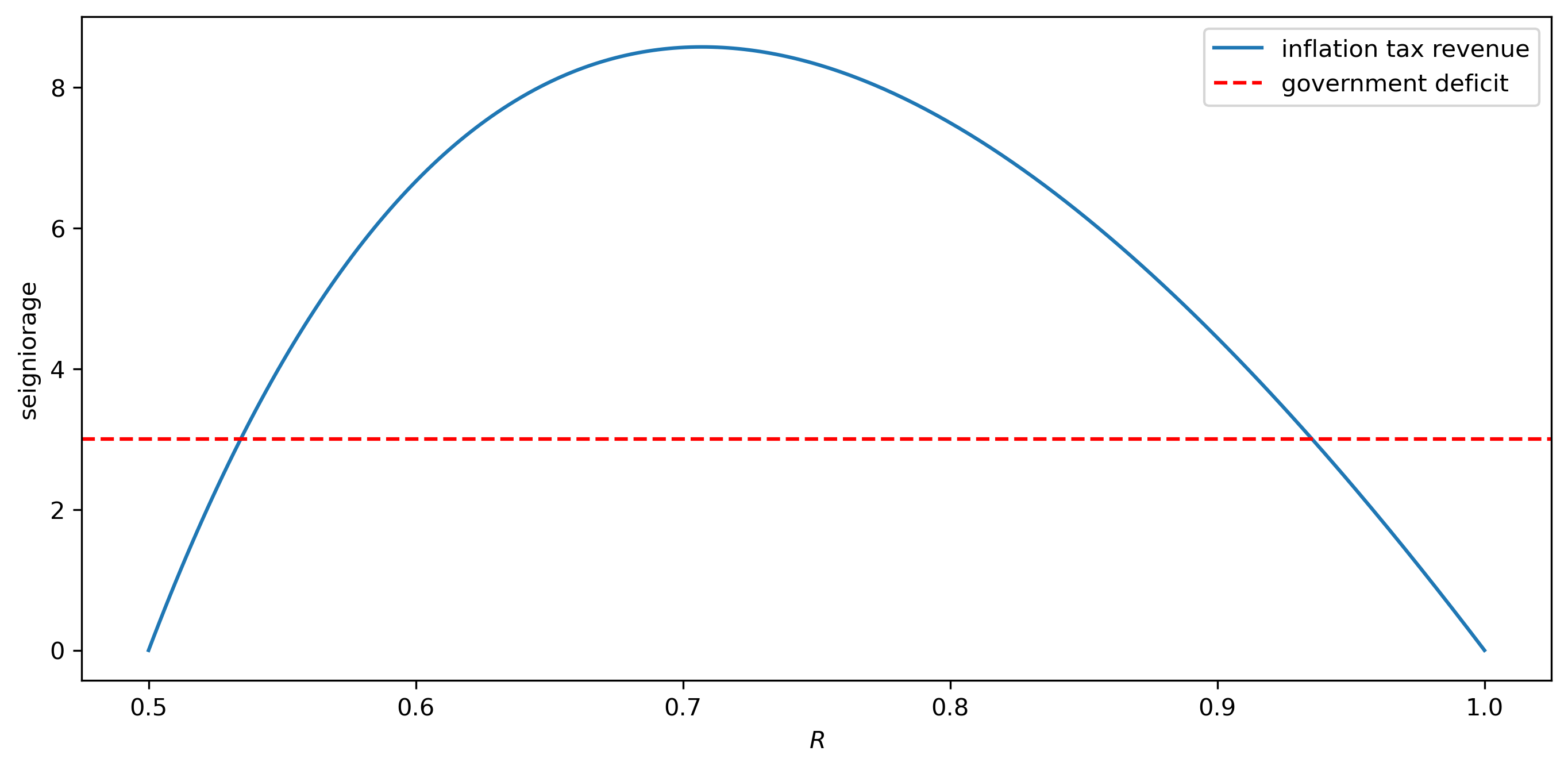 To compute a steady state, we seek gross rates of return on currency and real balances \(\bar R, \bar b\) that satisfy steady-state versions of both the government budget constraint and the demand function for real balances: