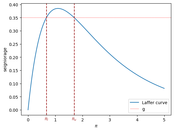 The following figure plots the steady state Laffer curve together with the two stationary inflation rates.