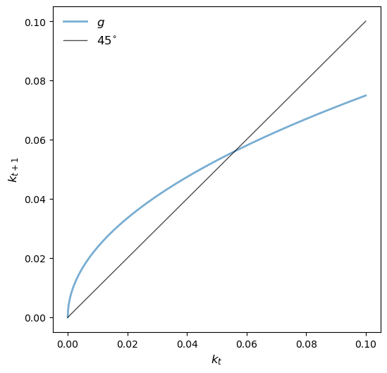Then we can use scipy.optimize.newton to solve \(f(k_{t+1}, k_t)=0\) for \(k_{t+1}\).