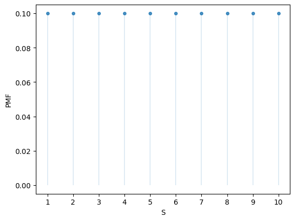 We can import the uniform distribution on \(S = \{1, \ldots, n\}\) from SciPy like so:
