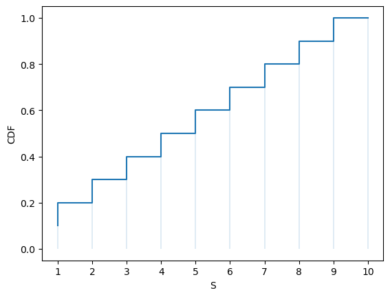 The CDF jumps up by \(p(x_i)\) at \(x_i\).