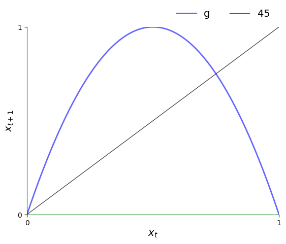 The plot shows the function \(g\) and the 45-degree line.