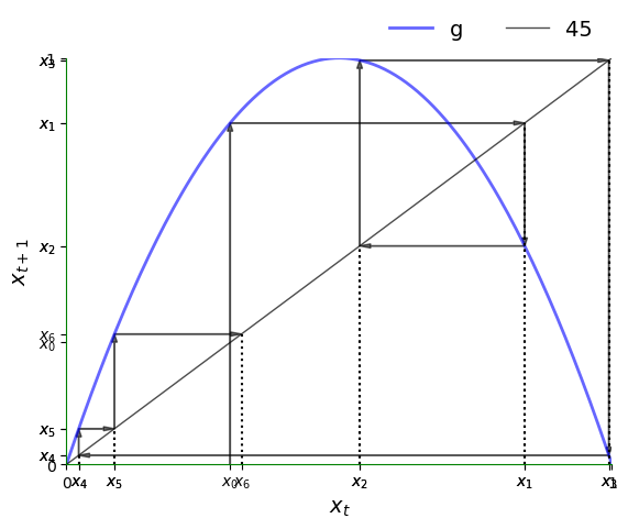 Recalling that \(g^n\) is the \(n\) compositions of \(g\) with itself, we can write the trajectory more simply as