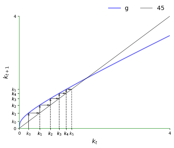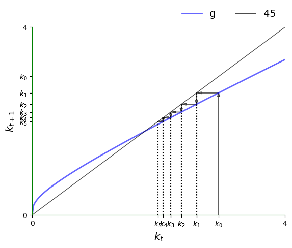 If \(g\) lies below the 45-degree line at this point, then we have \(k_{t+1} < k_t\).