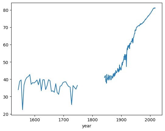 Now we have a dataset containing life expectancy and GDP per capita for a range of years.