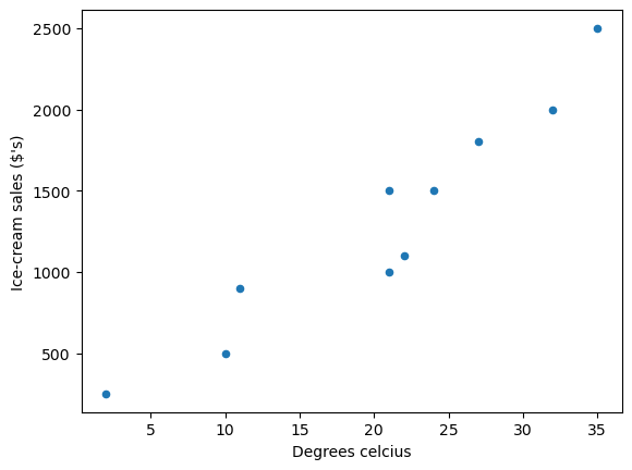 We can use a scatter plot of the data to see the relationship between \(y_i\) (ice-cream sales in dollars ($’s)) and \(x_i\) (degrees Celsius).