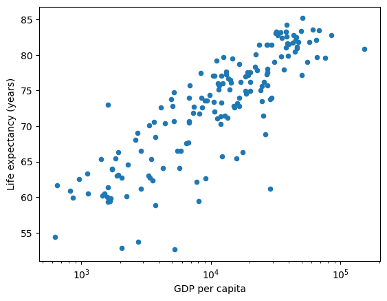 df.plot(x='gdppc', y='life_expectancy', kind='scatter', xlabel="GDP per capita", ylabel="Life expectancy (years)", logx=True);