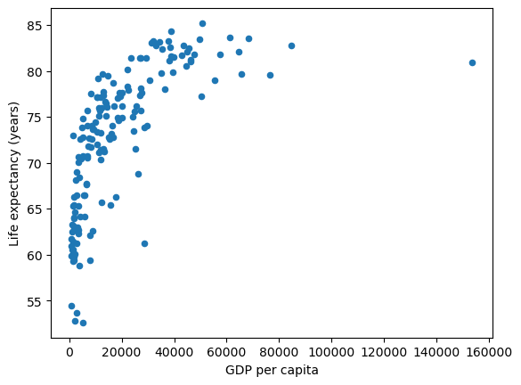 df.plot(x='gdppc', y='life_expectancy', kind='scatter', xlabel="GDP per capita", ylabel="Life expectancy (years)",);