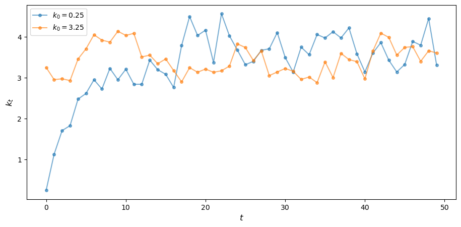 Our aim is to learn about the evolution of \(k_t\) over time, given an exogenous initial capital stock \(k_0\).