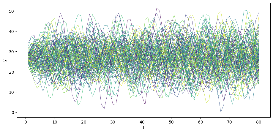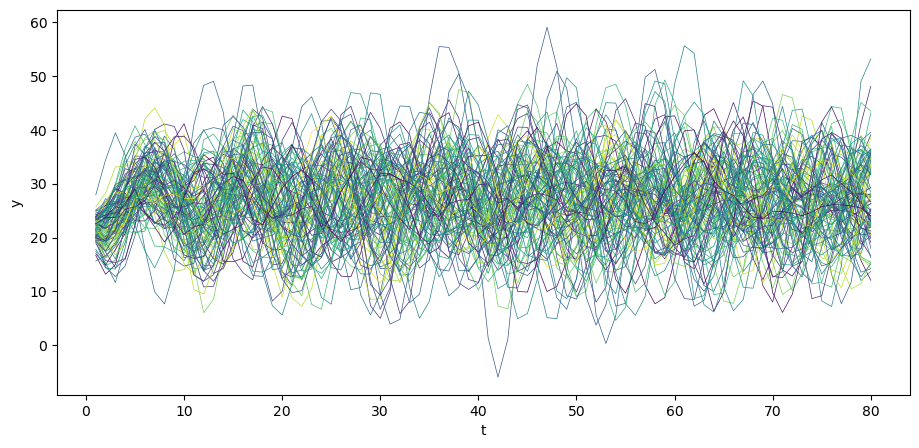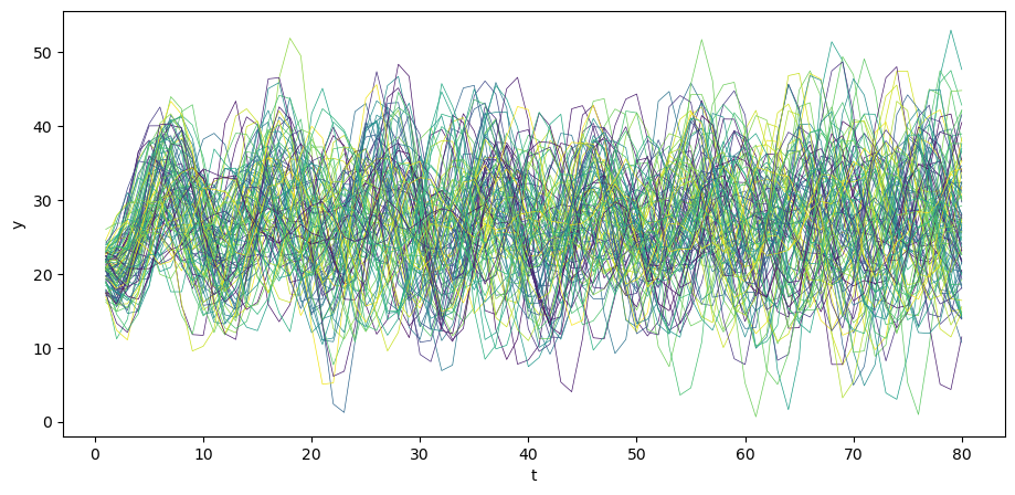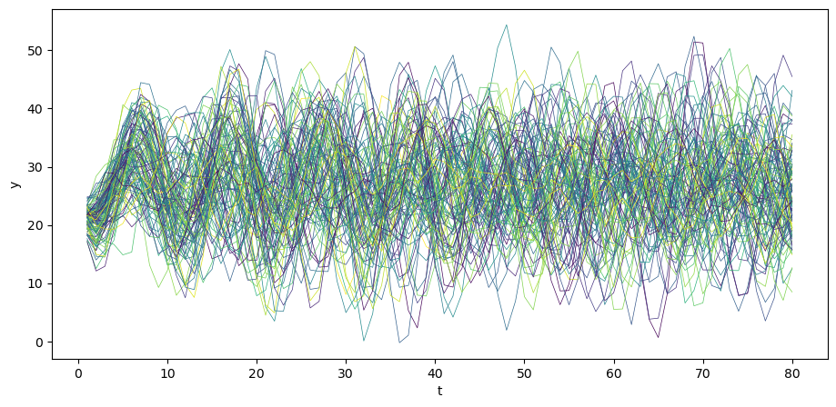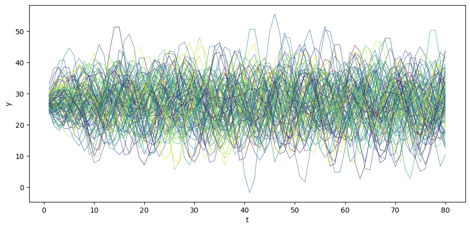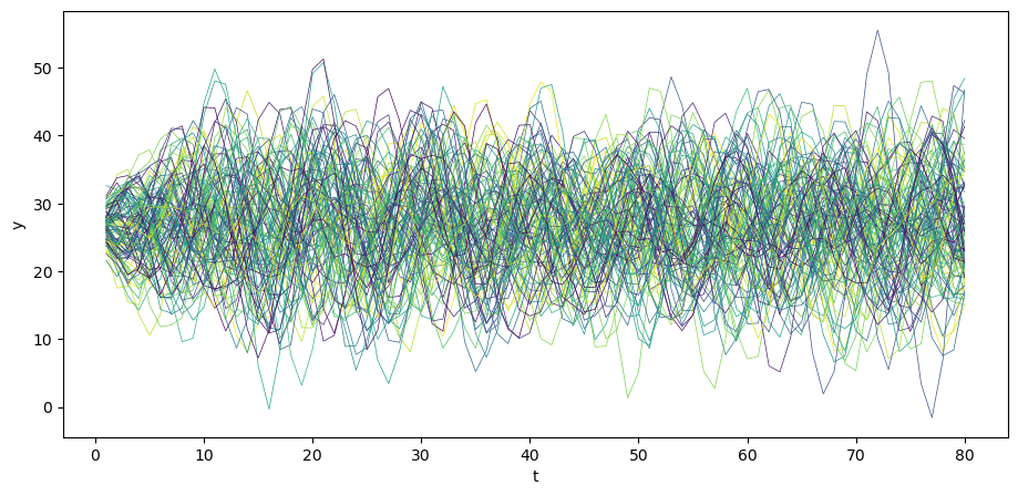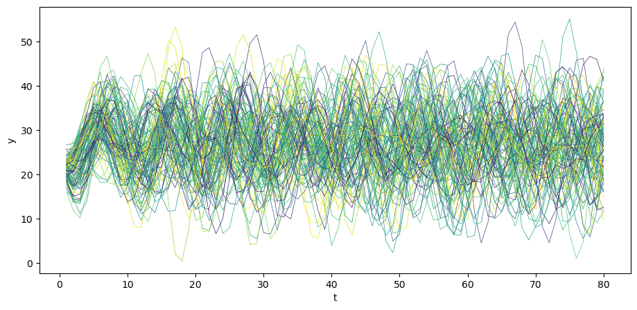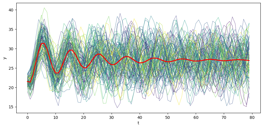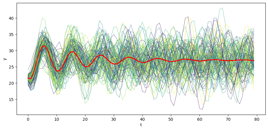 Let’s begin by generating \(N\) time realizations of \(y\) plotting them together with population mean \(\mu_y\) .